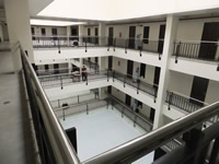 大きな建物全体が学校で、下層階がクラスや学生課、食堂などがあり、上層階は寮・ジム・自習室・生徒向けTV&PC ルームなどがあります。